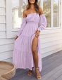 Women's Bohemian Sexy Off-Shoulder Long Sleeve Pleated High Waist Side Split Elegant A-Shape Layered Long Dress
